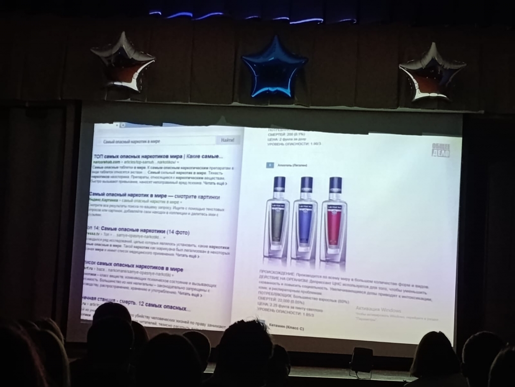 Для учащихся 8-х классов были продемонстрированы фильмы о вреде алкоголя, а затем проведена тест-игра. Из фильма обучающиеся узнали, что алкоголь наносит непоправимый вред развивающемуся организму подростка, особенно мозгу и нервной системе, что приводит к снижению интеллекта, ухудшению памяти и психическим нарушениям. Также поражаются другие органы: печень, сердце и сосуды, желудочно-кишечный тракт, мочевыводящая и репродуктивная системы. Помимо физических последствий, алкоголь разрушает личность, ведет к снижению успеваемости, изменению поведения и высокому риску развития зависимости.