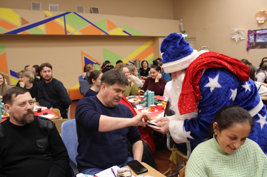 На этом праздничная атмосфера не закончилась. Под музыку «Российский Дед Мороз» на сцене появились Дед Мороз Богряшов А.Э. со Снегурочкой Обоскаловой А.А. В мешке Деда Мороза были спрятаны Письмо-благодарность педагогическому коллективу от администрации школы и календарики с пожеланиями для всех коллег.